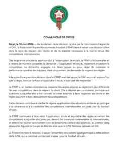 Après la décision rendue par la commission d’appel de la Confédération africaine de football, la Fédération Royale Marocaine de Football exprime sa satisfaction et réaffirme son attachement au respect strict des règlements. L’instance marocaine insiste sur la nécessité de préserver la crédibilité des compétitions africaines et de garantir une application équitable des textes.